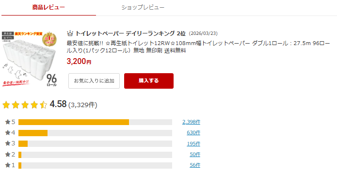 楽天市場で人気の高い再生紙トイレットペーパーです。